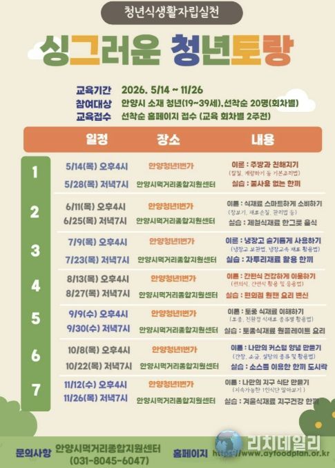 오는 4월 30일 어르신 대상‘찾아가는 맞춤 영양교육’을 시작으로 연말까지 다채로운 프로그램이 이어진다. 5월에는 제철식재료를 활용한‘계절한입, 오늘의 밥상’과 청년대상 ‘싱그러운 청년토랑’, 6월에는 ‘식탁위의 어린이 생태농장’, ‘우리동네 팜투테이블’, ‘먹거리 이해력 아카데미’등이 차례로 진행된다.
