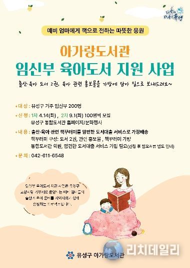지원 대상은 유성구에 거주하는 임신부 100명으로, 선정된 대상자에게는 태교·육아 관련 도서 2권과 가방, 출산·육아 관련 홍보물로 구성된 책꾸러미를 제공한다.