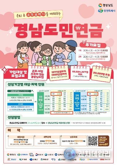 리치데일리 김상현 기자 | 창원특례시는 은퇴 후 국민연금 수령 전까지 소득공백기 대비와 노후준비 지원을 위해 지난 1월 ‘경남도민연금’ 가입자 모집에 이어 4월 추가모집을 시행한다고 밝혔다.