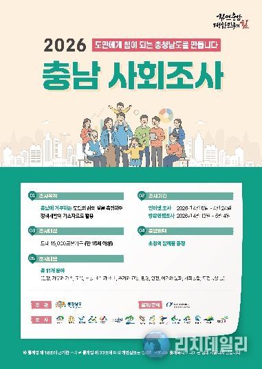 리치데일리 김상현 기자 | 논산시는 오는 4월 13일부터 5월 4일까지 관내 1,020가구의 만 15세 이상 가구주 및 가구원을 대상으로 ‘2026 충남사회조사’를 실시한다.