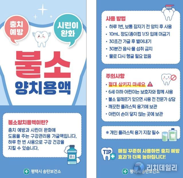 리치데일리 김상현 기자 | 평택시는 시민들이 일상에서 손쉽게 구강건강을 관리할 수 있도록 보건소 내에 불소양치용액 분배기를 설치·운영하고 있다고 밝혔다.