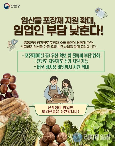 중동전쟁 장기화로 포장재 수급 불안이 커짐에 따라, 산림청은 임산물 가공·유통 보조사업을 확대 지원합니다.