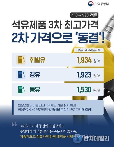 리치데일리 김상현 기자 | ■ 석유제품 3차 최고가격 2차 가격으로 '동결'! (4.10.~4.23. 적용)