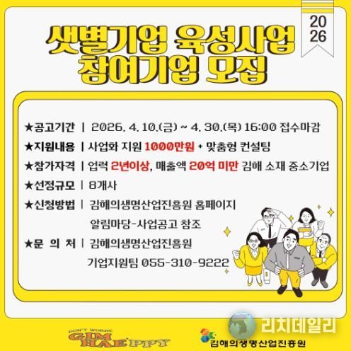 리치데일리 김상현 기자 | 김해의생명산업진흥원은 지역 내 저평가된 유망기업을 발굴하고 정책 사각지대를 해소하기 위해 ‘2026년 샛별기업 육성사업’을 추진하고, 오는 4월 10일부터 30일까지 참여기업을 모집한다고 밝혔다.