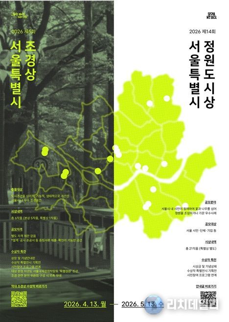 리치데일리 김상현 기자 | 서울시는 도시경관 개선에 기여한 우수 조경공간과 시민참여 정원 사례를 발굴·확산하기 위해 '2026 서울특별시 조경상·정원도시상' 공모를 4월 13일부터 5월 13일까지 진행한다고 밝혔다.