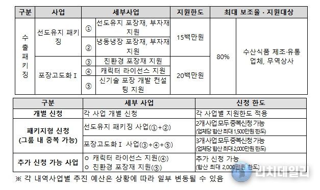 수산식품 수출업체당 최대 2,000만 원까지 ▲ 선도유지 포장재․부자재 ▲ 냉동·냉장 포장재․부자재 ▲ 친환경 포장재․부자재 ▲ 캐릭터 사용권 ▲포장재 개발 컨설팅 등 수출에 필요한 다양한 분야를 지원한다.