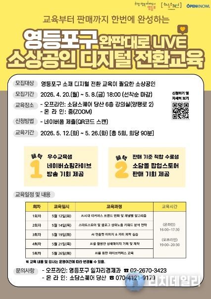 참가를 희망하는 소상공인은 4월 20일부터 5월 8일까지 홍보 포스터에 게시된 ‘네이버폼’ 양식으로 신청할 수 있다. 더 자세한 내용은 구청 누리집 ‘우리구소식’ 게시판을 확인하거나 영등포구청 일자리경제과로 문의하면 된다.