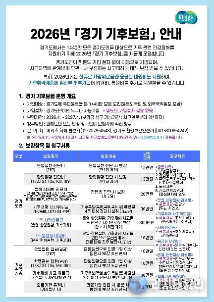 올해 경기 기후보험은 도민의 의료비 부담을 직접적으로 덜어주기 위해 보장 금액은 올리고, 신규 보장 항목도 추가했다.