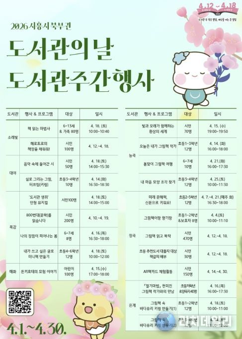 리치데일리 김상현 기자 | 시흥시 북부권 공공도서관은 4월 12일 ‘도서관의 날’과 4월 12일부터 18일까지 이어지는 ‘도서관주간’을 기념해 다양한 독서문화 행사와 현장 참여 이벤트를 4월 한 달간 운영한다.