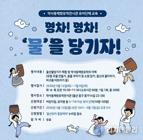 전시관 관계자는 “울산의 독특한 수리민속인 ‘물당기기’를 아이들의 눈높이에 맞춰 놀이 형식으로 재구성했다”라며 “이번 체험을 통해 함께 힘을 모아 어려움을 극복하던 우리의 공동체 문화를 자연스럽게 배우는 계기가 되길 바란다”라고 말했다.