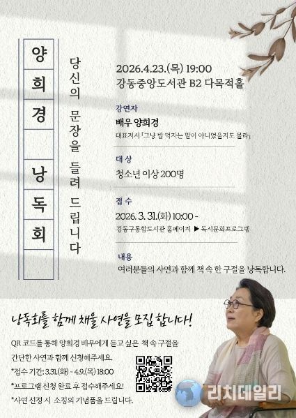 이번 프로그램은 도서관이 단순히 머무는 공간을 넘어 도서관 이용자가 직접 프로그램의 주체로 참여하고 창작과 소통을 경험하는 공간이 될 수 있도록 기획됐다. 대표 프로그램으로는 배우 양희경과 함께하는 낭독회 '당신의 문장을 들려드립니다'가 준비되어 있다. 세계 책의 날을 맞아 4월 23일 오후 7시에 시작될 이 프로그램은 사전 공모를 통해 접수된 구민들의 사연과 문장을 라디오 형식으로 낭독하고 이야기를 나누는 방식으로 진행된다. 배우 양희경의 마음을 어루만져 주는 목소리가 참여자들에게 깊은 공감과 따뜻한 위로를 전하며 문학을 보다 친근하게 만날 수 있는 특별한 시간을 선사할 예정이다.