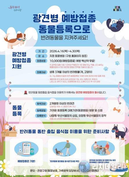 구는 접종 지원기간 동안 광견병 백신을 무료로 지원하며, 보호자는 시술료 1만 원만 부담하면 된다. 접종 가능한 동물병원 현황 등 자세한 사항은 구청 누리집(홈페이지)에서 확인할 수 있다.