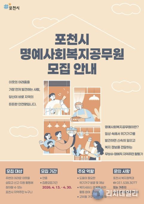 리치데일리 김상현 기자 | 포천시는 복지사각지대 해소와 위기이웃 발굴을 위해 ‘명예사회복지공무원’을 오는 30일까지 집중 모집한다.