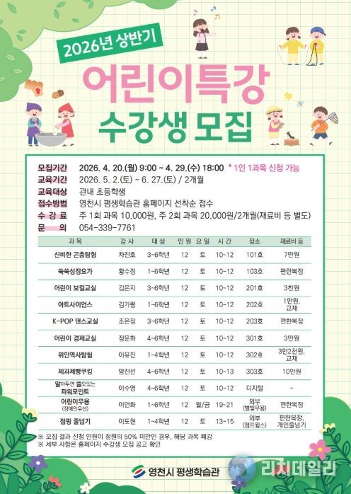리치데일리 김상현 기자 | 영천시 평생학습관(관장 정경자)은 관내 초등학생을 대상으로 ‘2026년 상반기 어린이특강’ 수강생을 20일부터 선착순으로 모집한다.