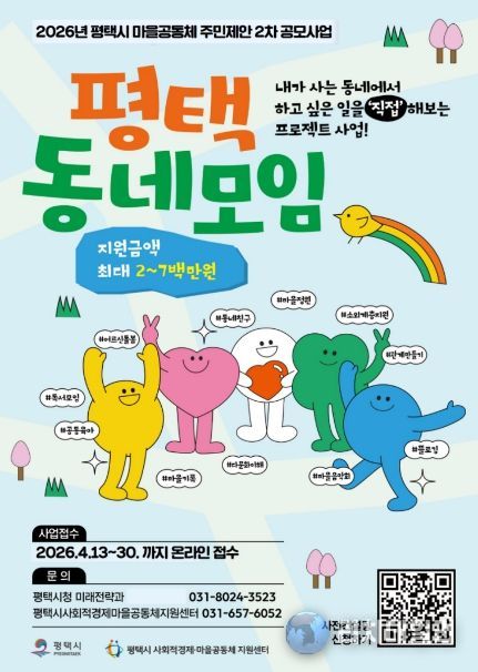 리치데일리 김상현 기자 | 평택시는 주민들이 스스로 만들어가는 만남과 소통의 마을 공간에서 지속 가능한 공동체 활동을 지원하고자, 지난 13일부터 녪년 평택시 마을공동체 주민제안 2차 공모사업’을 추진한다고 밝혔다.