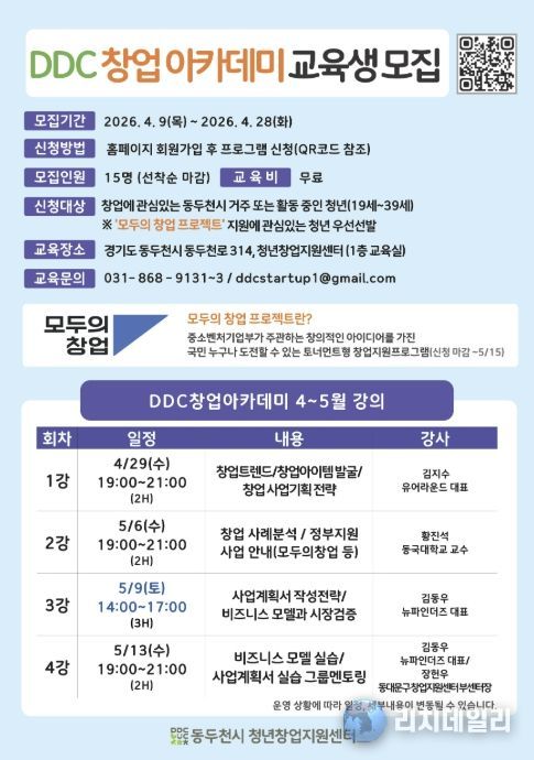 모집 대상은 동두천시에 거주하거나 활동 중인 19세부터 39세까지의 청년으로, 창업에 관심 있는 누구나 신청할 수 있다. 모집 인원은 15명 내외이며, 참가비는 무료다.