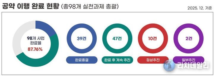 2025년 12월 말 기준 나주시는 총 98개 공약 사업 중 86개를 완료하거나 이행 후 추진해 87.76%의 이행률을 기록했으며 이는 전국 평균 70.42%보다 17.34%p, 전남 평균 68.27%보다도 크게 높은 수치다.