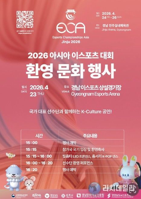리치데일리 김상현 기자 | 경상남도와 경남문화예술진흥원은 4월 24일 개막하는 ‘2026 아시아 이스포츠 대회’를 앞두고, 관람객 유입 확대를 위해 다양한 연계행사를 운영하며 본격적인 대회 분위기 조성에 나선다고 밝혔다.