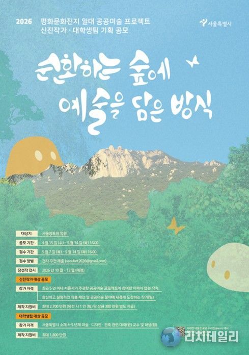 신진작가 공공미술 작품 공모 :‘순환하는 숲에 예술을 담은 방식'이라는 주제로 서울창포원 일원에 자연과 인간의 공존을 탐색한 작품을 공모한다. 선정 작가에게는 전문가 워크숍과 제작·전시 비용이 지원된다.