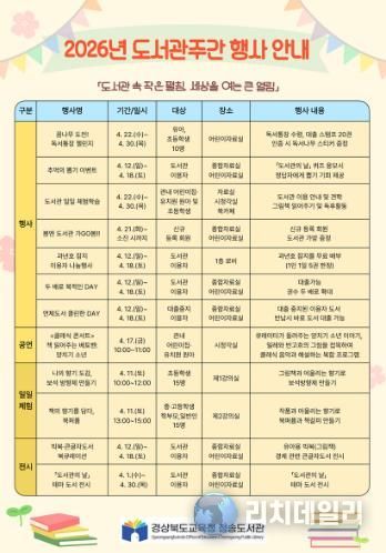 리치데일리 김상현 기자 | 경상북도교육청 청송도서관이 2026년 4월 도서관주간을 맞이하여 ‘도서관 속 작은 펼침, 세상을 여는 큰 열림’을 주제로 다양한 독서·문화 프로그램을 운영한다.