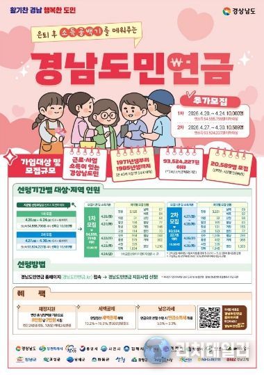 시는 경남도의 시·군별 일정에 따라 (1차) 4.22. ~ 4.24. / (2차) 4.29. ~ 4.30일까지 2026년 경남도민연금 지원사업 추가 가입자 2,519명을 모집한다. 이번 추가모집은 소득기준이 기존 4개 구간에서 2개 구간으로 완화되고 모집도 2차에 걸쳐 선착순으로 진행된다.