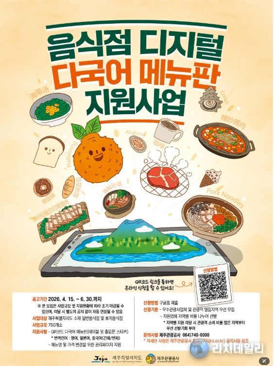 리치데일리 김상현 기자 | 제주특별자치도와 제주관광공사(사장 고승철)는 15일부터 온라인 채널을 통해 ‘디지털 다국어 메뉴판 지원사업’에 참여할 도내 음식점을 모집하고 있다.