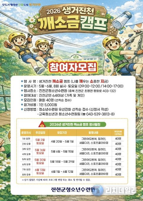 리치데일리 김상현 기자 | 충북 진천군은 관내 청소년과 가족이 함께 참여할 수 있는 체험활동과 인증 수련 프로그램을 제공하기 위해 ‘2026 생거진천 깨소금 캠프’ 참가자를 모집한다고 밝혔다.