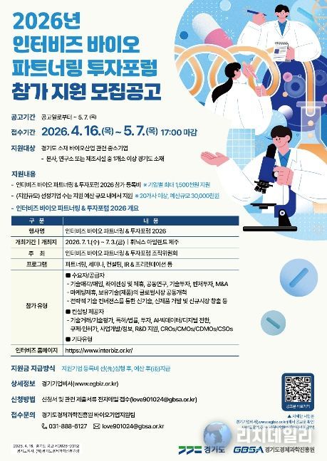 리치데일리 김상현 기자 | 경기도는 (재)경기도경제과학진흥원과 함께 도내 바이오·제약 기업의 기술사업화와 투자 활성화를 지원하기 위해 ‘인터비즈 바이오 파트너링&투자포럼 2026’에 참가할 기업을 모집한다.