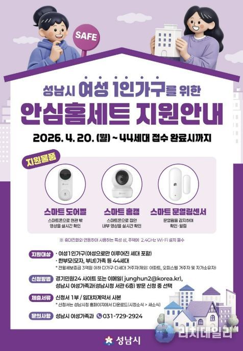 리치데일리 김상현 기자 | 성남시는 여성 1인 가구의 범죄예방과 안전한 주거생활을 위해 ‘안심 홈세트 3종’을 지원한다고 16일 밝혔다.