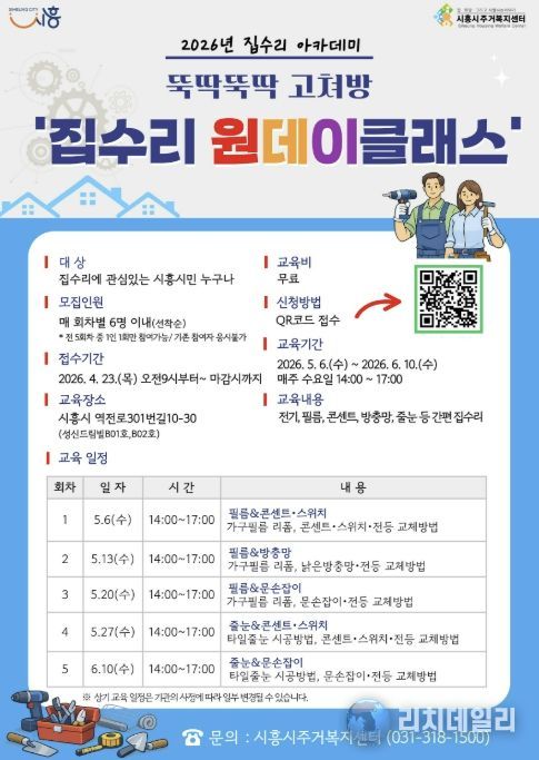 리치데일리 김상현 기자 | 시흥시주거복지센터는 오는 5월부터 시민들의 자가 주거관리 역량 강화를 위해 2026년 집수리 아카데미 ‘뚝딱뚝딱 고쳐방’ 원데이 클래스를 진행하는 가운데 참가 교육생을 모집한다.