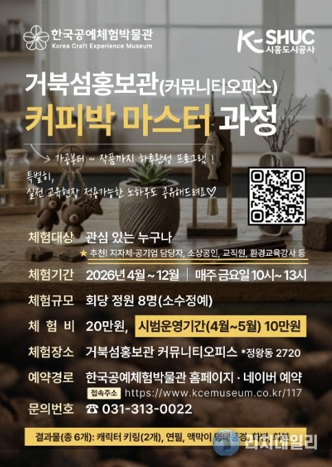 ‘커피박 마스터 과정’은 버려지는 커피박(커피 찌꺼기)을 활용한 공예 제작의 모든 과정을 경험할 수 있는 전문 교육 프로그램으로, 2026년 4월부터 12월까지 매주 금요일 오전 10시부터 13시까지 운영된다. 본 과정은 가공부터 작품 제작까지 하루 3시간 완성형으로 진행되며, 실전 교육 현장에서 활용 가능한 노하우를 함께 제공한다. 참여자는 캐릭터 키링, 연필, 명태풍경, 화병, 화분 등 총 6개의 공예품을 제작할 수 있다. 체험 정원은 회당 8명 소수정예로 운영되며, 체험비는 20만원이다. 단, 시범운영 기간(4월~5월)에는 10만원으로 적용된다.