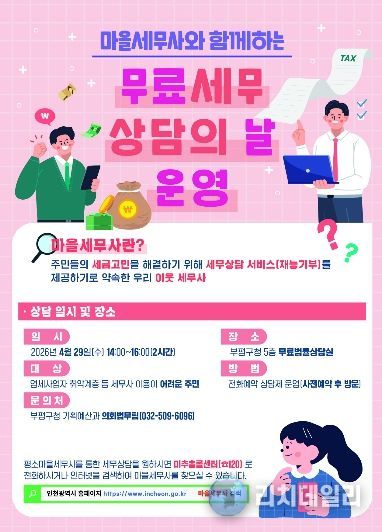 리치데일리 김상현 기자 | 부평구는 오는 29일 구청 5층 무료법률상담실에서 마을세무사와 함께하는 ‘무료 세무 상담의 날’을 운영한다.