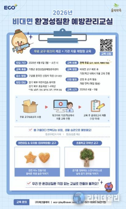 리치데일리 김상현 기자 | 가평군 환경성질환예방관리센터 ‘숲의 약속’이 어린이들의 건강한 생활 습관 형성을 돕기 위해 ‘2026년 비대면 환경성질환 예방관리교실’ 참여 기관을 모집한다.