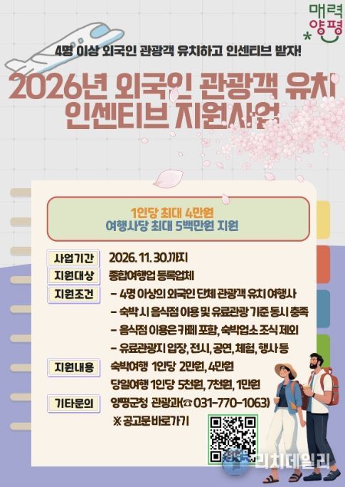 리치데일리 김상현 기자 | 양평군은 외국인 관광객 유치를 촉진하고 침체된 지역 관광산업에 활력을 불어넣기 위해 ‘2026년 양평군 외국인 관광객 유치 인센티브 지원사업’을 추진한다고 밝혔다.
