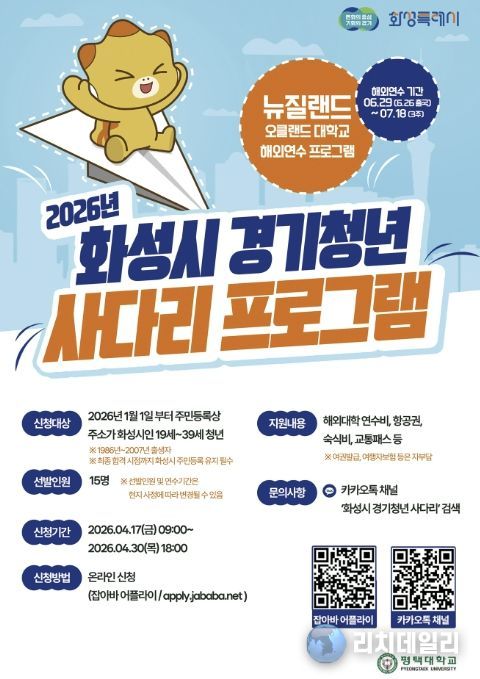 리치데일리 김상현 기자 | 화성특례시는 해외 연수를 희망하는 청년들에게 경제적 부담 없이 글로벌 경험을 쌓을 수 있는 ‘화성시 경기청년 사다리 프로그램’(운영기관: 평택대학교 산학협력단) 2기 참여자를 모집한다.