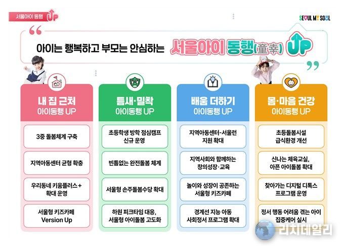 서울시가 양육가정, 특히 맞벌이 가구가 아이돌봄 고민 때문에 직장을 그만두거나 일·생활 균형을 포기하지 않도록, 기존 아이돌봄 체계를 한 단계 업그레이드한 '서울아이 동행(童幸) UP 프로젝트'를 발표했다.