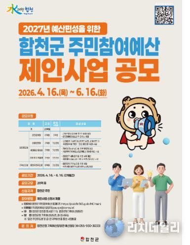 리치데일리 김상현 기자 | 합천군은 2027년도 예산편성을 위한 주민참여예산 제안사업 공모를 6월 16일까지 실시하며, 올해부터 공모 분야를 기존 1개 모델 3개 유형에서 3개 모델 5개 유형으로 확대 개편한다고 밝혔다.