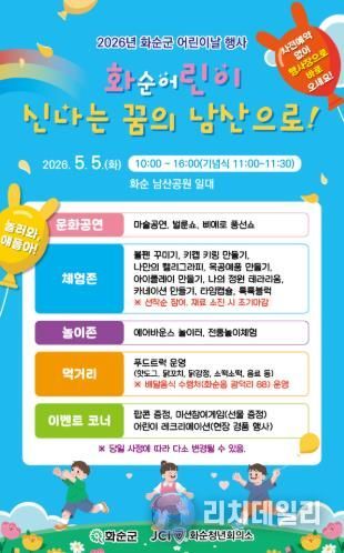 군은 오는 5월 5일 남산공원 일원에서 ‘화순 어린이 신나는 꿈의 남산으로’를 부제로 한 ‘2026년 화순군 어린이날 행사’를 개최한다.