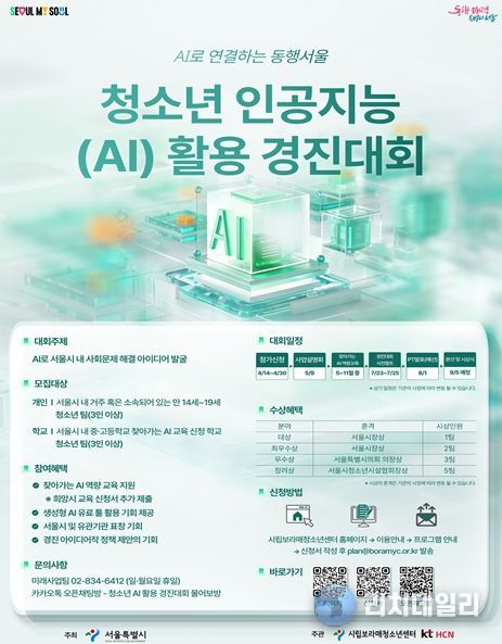 리치데일리 김상현 기자 | 서울시는 청소년이 인공지능(AI)을 활용해 지역사회 문제해결 아이디어를 제안하고 이를 공공정책으로 연결하는 '2026 청소년 인공지능(AI) 활용 경진대회'를 개최하고 4월 30일까지 참가자를 모집한다.