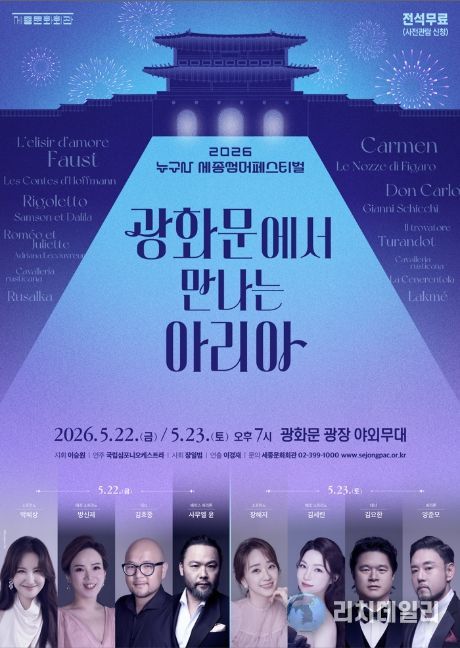 리치데일리 김상현 기자 | 세종문화회관은 서울시민 누구나 즐길 수 있는 세종 썸머 페스티벌 '광화문에서 만나는 아리아'를 오는 5월 22일과 23일, 양일간 광화문 광장에서 개최한다. 광화문 광장은 시민 중심의 공간으로 새롭게 거듭난 이후 서울을 대표하는 문화 명소로 자리해 왔으며, 그 중심에서 세종문화회관은 한국 문화예술을 상징하는 공간으로 자리해 왔다. 이러한 공간적 맥락 속에서 세종문화회관과 광화문 광장은 문화의 전통성과 동시대성을 함께 품은 열린 문화예술 플랫폼으로 그 의미를 확장해가고 있다.