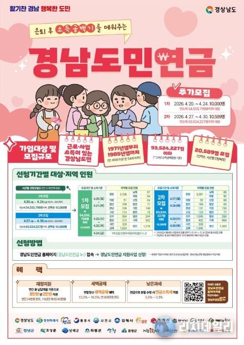 경남도 관계자는 “이번 추가 모집은 그간 정책 소외계층이었던 4050세대 도민의 요구를 도와 시군이 적극 반영한 결과물”이라며, “경남도민연금이 소득 공백기를 앞둔 도민들에게 실질적인 버팀목이 되기를 바란다”고 밝혔다.