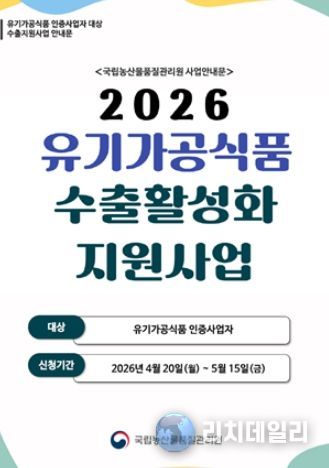 리치데일리 김상현 기자 | 국립농산물품질관리원은 국내 유기가공식품의 해외 시장 진출을 돕기 위해 20일부터 ‘2026년 유기가공식품 수출 활성화 지원사업’을 추진한다고 밝혔다. 해외 시장 진출에 어려움을 겪는 유기가공식품 인증사업자들에게 수출 준비부터 해외 구매자 연결까지, 맞춤형 지원을 제공해 판로 확대에 기여할 것으로 기대된다.