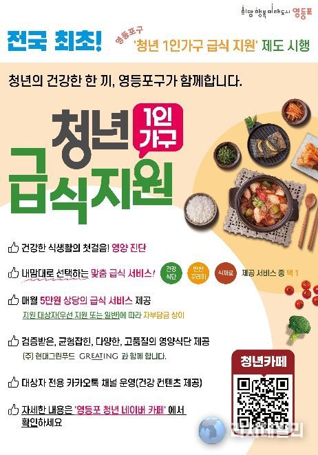 리치데일리 김상현 기자 | 영등포구가 혼자 사는 청년들의 건강한 식생활을 보장하고 경제적 부담을 덜기 위해, 지난해 전국 최초로 도입한 ‘청년 1인가구 급식 지원’ 사업을 올해 확대 운영한다고 밝혔다.