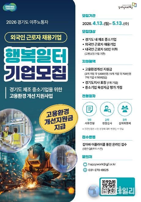 리치데일리 김상현 기자 | 경기도와 경기도일자리재단은 도내 외국인 근로자를 고용한 중소 제조기업을 대상으로 ‘2026년 경기도 이주노동자 행복일터 선정사업’ 참여기업을 모집한다고 20일 밝혔다.