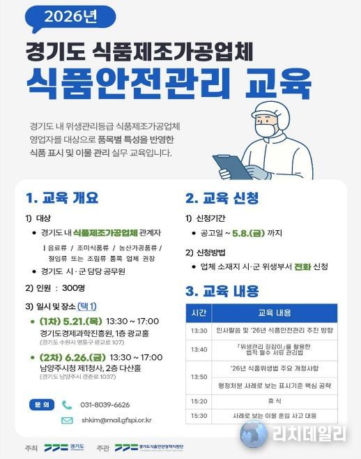 리치데일리 김상현 기자 | 경기도는 도내 식품제조·가공업체의 자율적 위생관리 역량을 강화하기 위해 ‘도내 식품제조·가공업체 위생관리 교육’ 참여자를 모집한다고 20일 밝혔다.