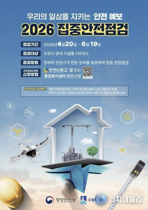 리치데일리 김상현 기자 | 수원특례시가 안전사고를 예방하고, 시민의 안전 의식을 고취하기 위해 20일부터 6월 19일까지 ‘2026년 집중안전점검’을 한다.