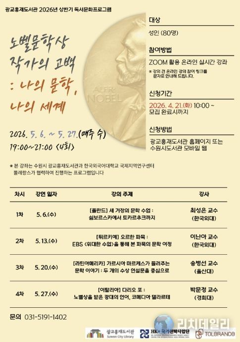 리치데일리 김상현 기자 | 수원시 광교홍재도서관이 한국외국어대학교와 협력해 진행하는 2026년 세계문화기행 시리즈 1편 ‘노벨문학상 작가의 고백 : 나의 문학, 나의 세계’ 강좌를 수강할 시민을 모집한다.