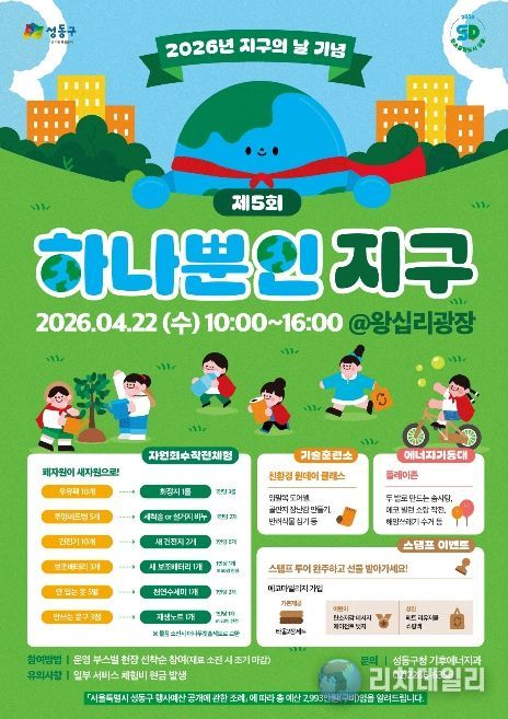 리치데일리 김상현 기자 | 서울 성동구는 오는 4월 22일 왕십리광장에서 기후위기의 심각성을 알리고 탄소중립 실천 문화를 확산하기 위한 ‘제5회 하나뿐인 지구’ 행사를 개최한다고 밝혔다.