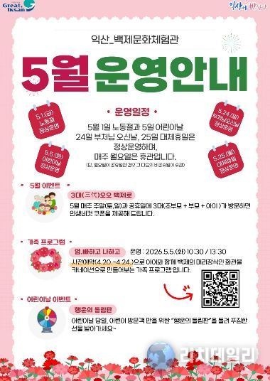 5월 5일 어린이날에는 가족이 함께 카네이션 화관을 만드는 체험을 운영한다. 행사는 오전 10시 30분과 오후 1시 30분에 진행되며, 오는 20~24일 익산시 통합예약시스템을 통해 사전 신청을 받는다.