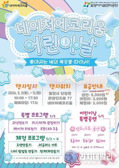 리치데일리 김상현 기자 | 밀양시시설관리공단(이사장 김경민)은 오는 5월 2일부터 5일까지 어린이날을 맞아 선샤인 밀양 테마파크 내 네이처에코리움에서 가족 단위 방문객을 위한 ‘제3회 네이처에코리움 어린이날 행사’를 개최한다.